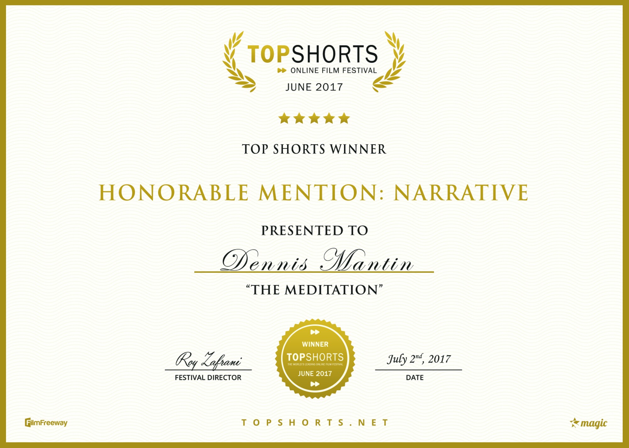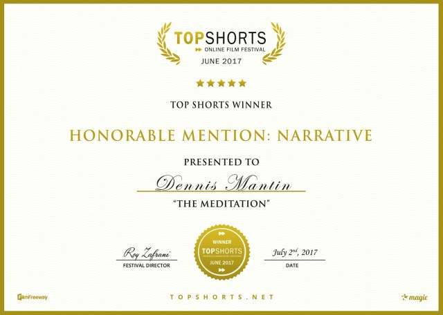 Honorable mention for Narrative from Top Shorts Film Festival – Dennis Mantin On July 4, 2017September 3, 2017 By dennismantinIn Writing Share this: Click to share on X (Opens in new window) X Click to share on Facebook (Opens in new window) Facebook Like Loading... Related