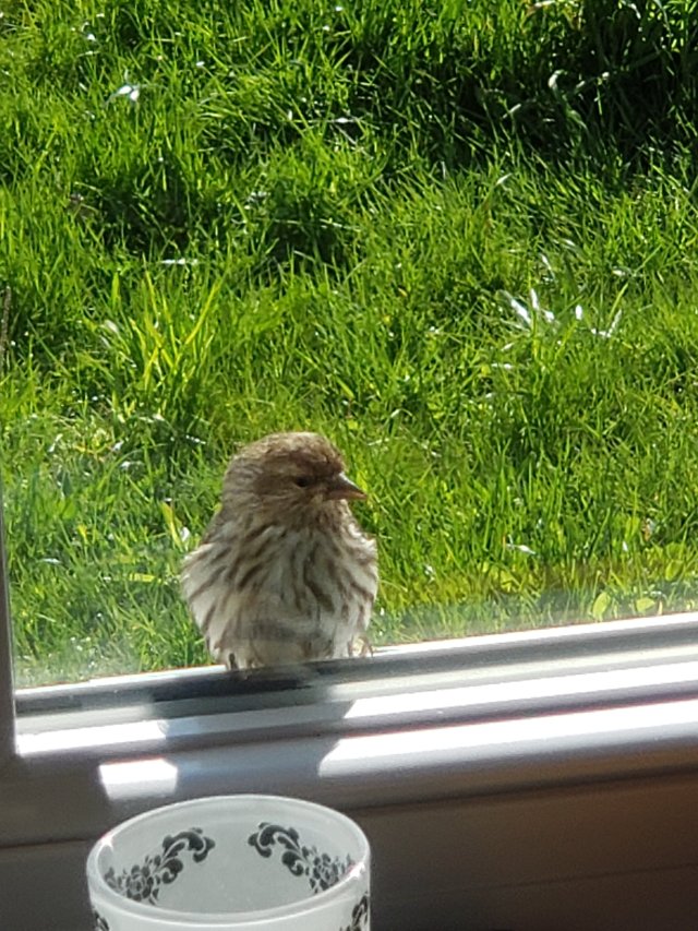 A bird sat for minutes on the window sill, looking into the house.Gloria said that it was a good omen…A bad omen is if the bird hits the window.I suggested especially for the bird.Dennis Mantin