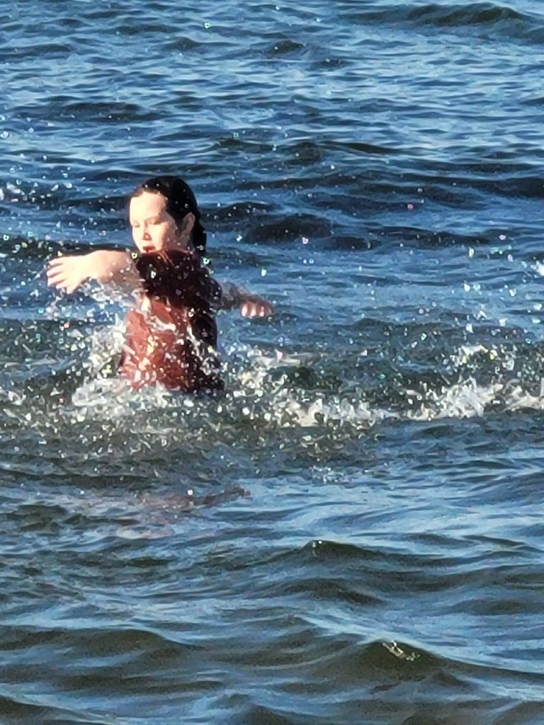 There was a woman in some sandals. Her hair was wet and black.