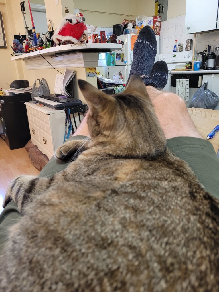 The cat ventured out today at 6a.m. when I returned and she came back when I got up at noon. Her belly fur was cold and wet and she was hungry, yet happy. She ate and purred, acknowledged my presence and then slept in her favorite chair.