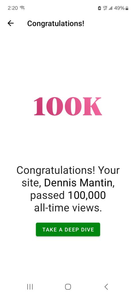 Thank You All For 100K! On April 25, 2024April 25, 2024 By dennismantinIn Writing Share this: Click to share on X (Opens in new window) X Click to share on Facebook (Opens in new window) Facebook Like Loading... Related